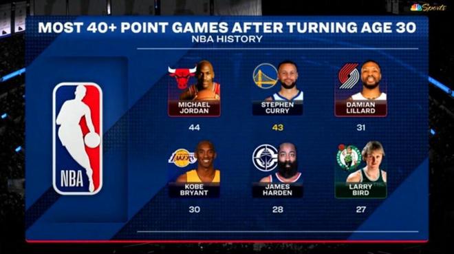 其次库里在30岁后已经第43次单场交出40+得分表现,高居NBA历史第二,距离第一的乔丹仅差一场。